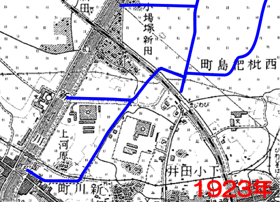 大正も後期になると、東海道線の西側一帯に工場が進出している。乙排水路が付替えられている。これは枇杷島駅の開業が影響したのであろうか。1906年にやや離れた場所にあった清洲駅を移設し改称する形で成立している。もとの清洲駅がどこにあったのかは分からない。