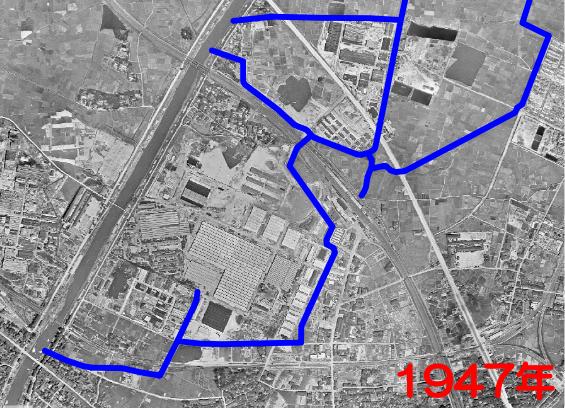 戦後に撮影された航空写真である。先の地図から四半世紀を経て、かなり複雑に流路の変化がしている。まず、大木曽江通りの下流部が付け替えられて直線的になっている。かつての流路跡が水田の地割に見受けられる。乙排水路は巨大工場の建設に伴って、東海道線の北側に新たな排水路を新設している。これを小場塚排水路と呼ぶ。本稿のみの便宜上の呼称ではなく、正式名所だ。