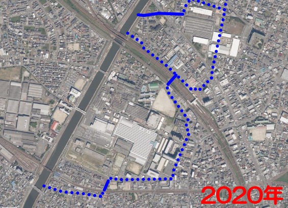 そして現在。まず、大木曽江通りが土地区画整理によって消滅。甲排水路はそのままの位置で残っているものの、写真範囲外の上流部は土地区画整理によって失われており、排水路というより山西用水の流れの一つという感じだ。甲排水路からの分水は、工場の進出によって分水地点が北に移動し、水路の半分くらいが付け替え・暗渠化された。